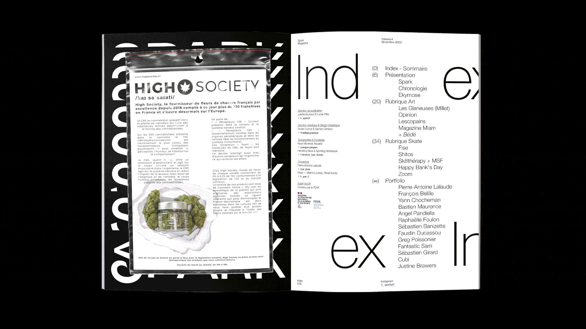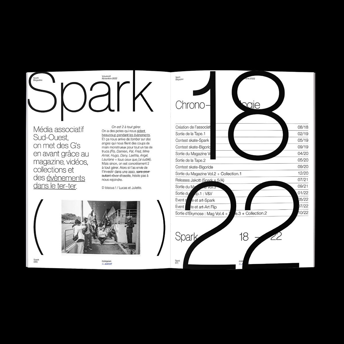 Le magazine Spark mêle skate, art et photographie. La conception de cette édition découle d’une association avec différents photographes, riders, musiciens, écrivains, plasticiens… ; tous issus d'un univers différent mais avec l’envie de représenter la culture urbaine du Sud-Ouest de la France à travers une collaboration expérimentale mais avant tout sociale.